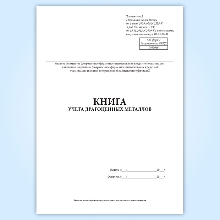 Форма книги учета драгоценных металлов соответствует Приложению 2 к Указанию Банка России от 1 июля 2009 года N 2255-У . Записи об остатках драгоценных металлов в книге осуществляются заведующим кассой по окончании осуществления приема, выдачи драгоценных металлов в конце рабочего дня на основании приходных кассовых ордеров, расходных кассовых ордеров, ордеров по передаче ценностей, актов, документов, содержащих основные характеристики драгоценного металла, и документов (копий документов) организаций-изготовителей, содержащих сведения о соответствии драгоценного металла установленным в Российской Федерации стандартам или международным стандартам качества, и другой сопроводительной документации к драгоценным металлам.