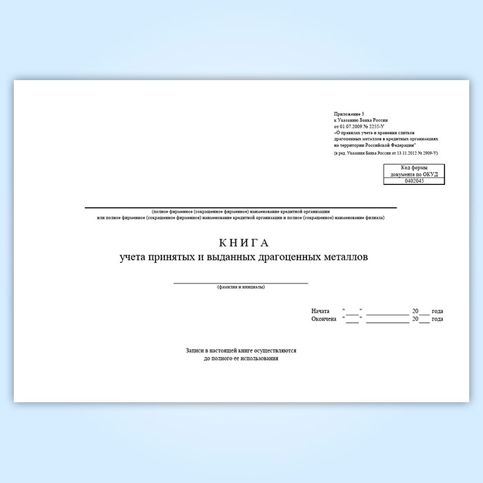 Форма книги учета принятых и выданных драгоценных металлов соответствует Приложению 3 к Указанию Банка России от 01.07.2009 № 2255-У «О правилах учета и хранения слитков драгоценных металлов в кредитных организациях на территории Российской Федерации" (в ред. Указания Банка России от 13.11.2012 № 2909-У).