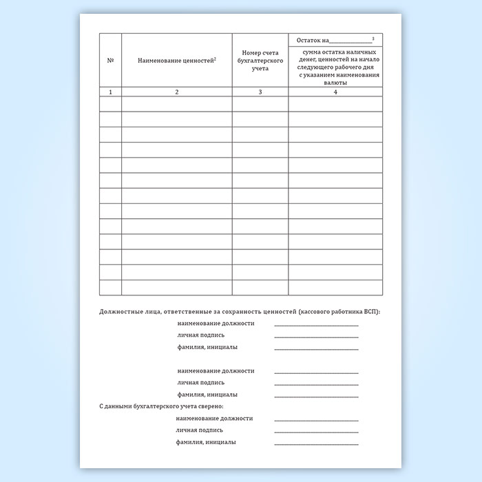 4. Остаток на__________________ (сумма остатка наличных денег, ценностей на начало следующего рабочего дня с указанием наименования) валюты