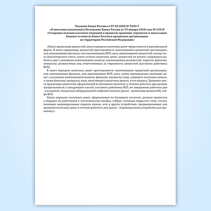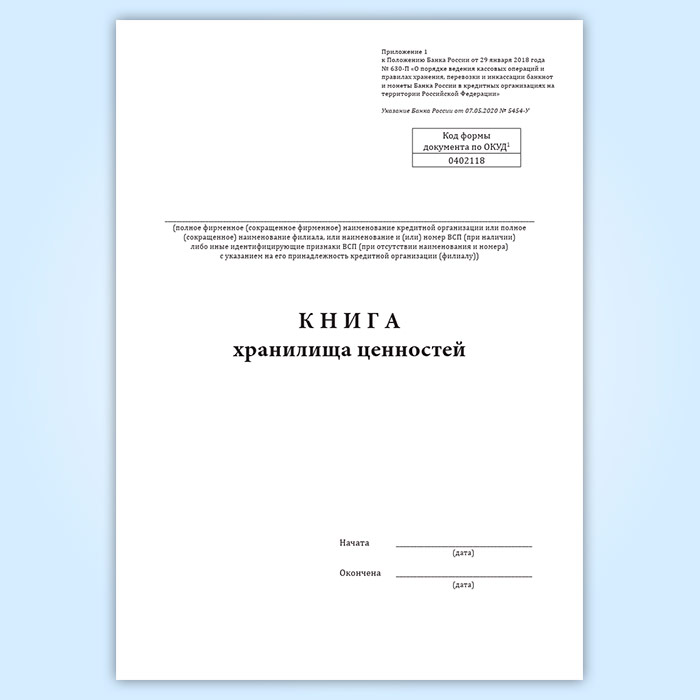 Форма книги хранилища ценностей (по ОКУД 0402118) соответствует Приложению 1 к Положению Банка России от 29 января 2018 года № 630-П " О порядке ведения кассовых операций и правилах хранения, перевозки и инкассации банкнот и монеты Банка России в кредитных организациях на территории Российской Федерации" (в редакции Указания Банка России от 07.05.2020 № 5454-У)