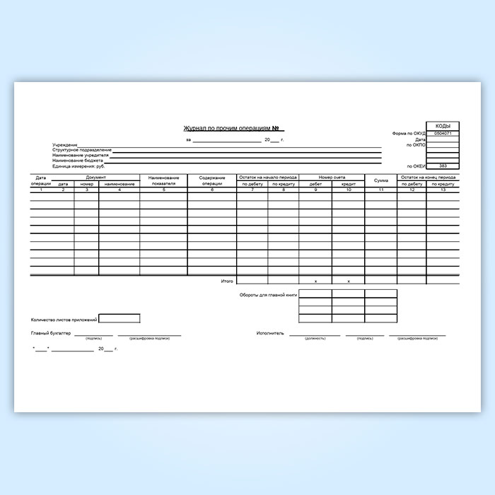 См. также Журнал операций форма 0504071, который имеет аналогичные графы и вертикальную форму.
