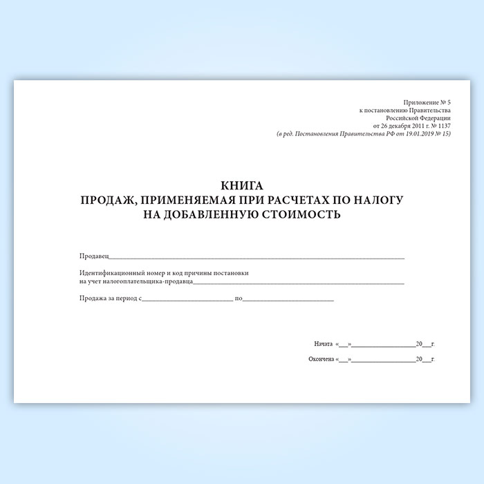 Форма книги продаж, применяемой при расчетах по НДС соответствует Приложению 5 к Постановлению Правительства РФ от 26.12.2011 N 1137 " О формах и правилах заполнения (ведения) документов, применяемых при расчетах по налогу на добавленную стоимость"