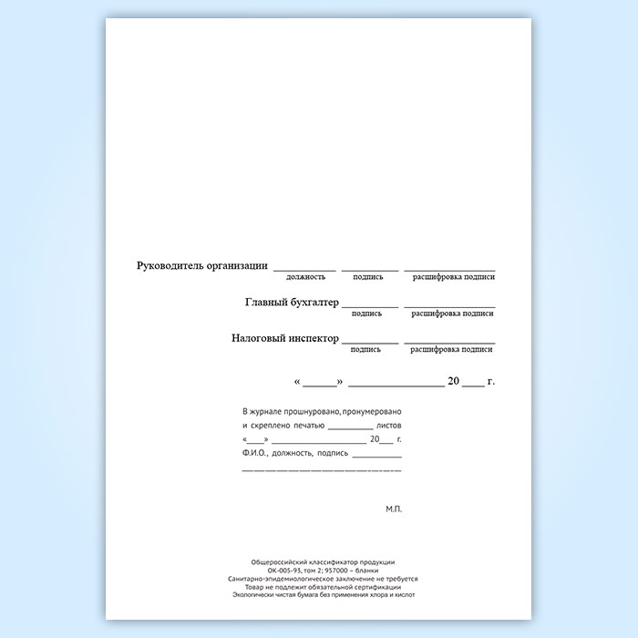 Журнал кассира-операциониста должен быть прошнурован, пронумерован и скреплен подписями налогового инспектора, руководителя и главного (старшего) бухгалтера организации и печатью.