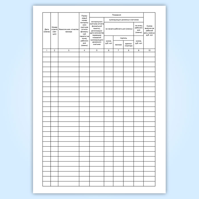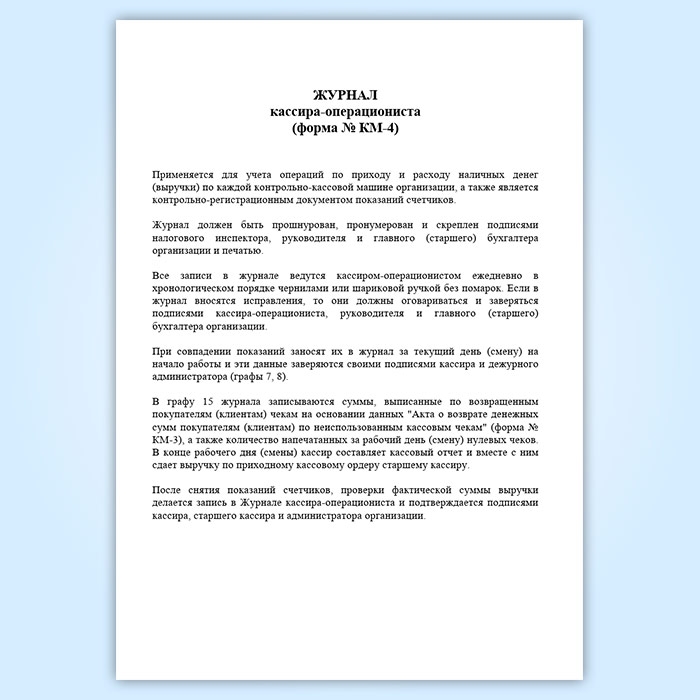 Журнал кассира-операциониста (Форма КМ-4) применяется для учета операций по приходу и расходу наличных денег (выручки) по каждой контрольно-кассовой машине организации, а также является контрольно-регистрационным документом показаний счетчиков.