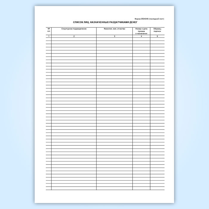 В конце книги приводится список лиц, назначенных приказом руководителя учреждения раздатчиками денег. Выдача наличных денежных средств иным лицам не разрешается.
