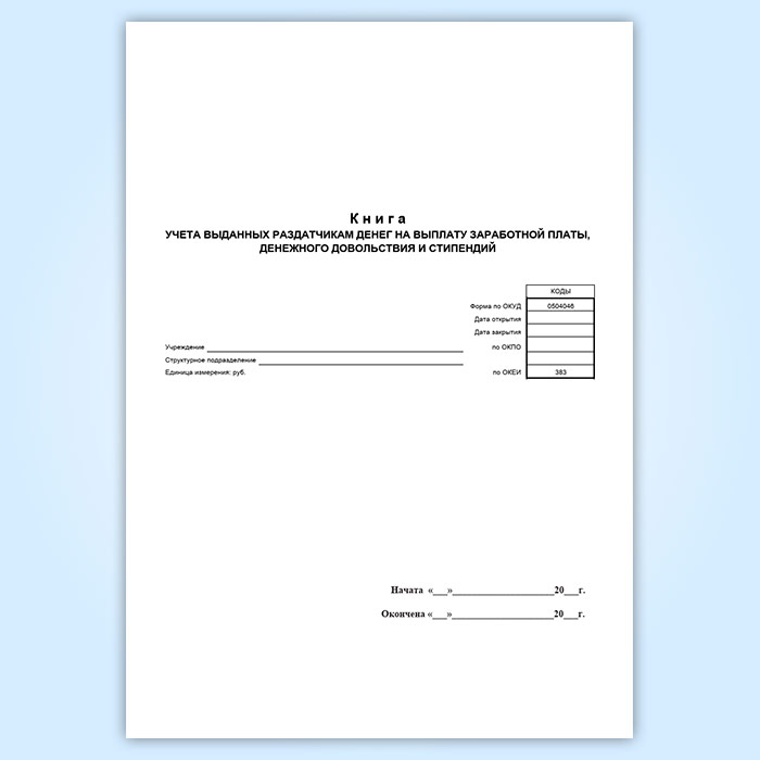Книга учета выданных раздатчикам денег на оплату труда, денежного довольствия и стипендий (Форма по ОКУД 0504046) применяется для обобщения сведений о выданных из кассы суммах наличных денег на оплату труда, пособий по временной нетрудоспособности, денежного довольствия, стипендий через уполномоченных работников учреждения, с которыми заключены договоры о полной материальной ответственности.