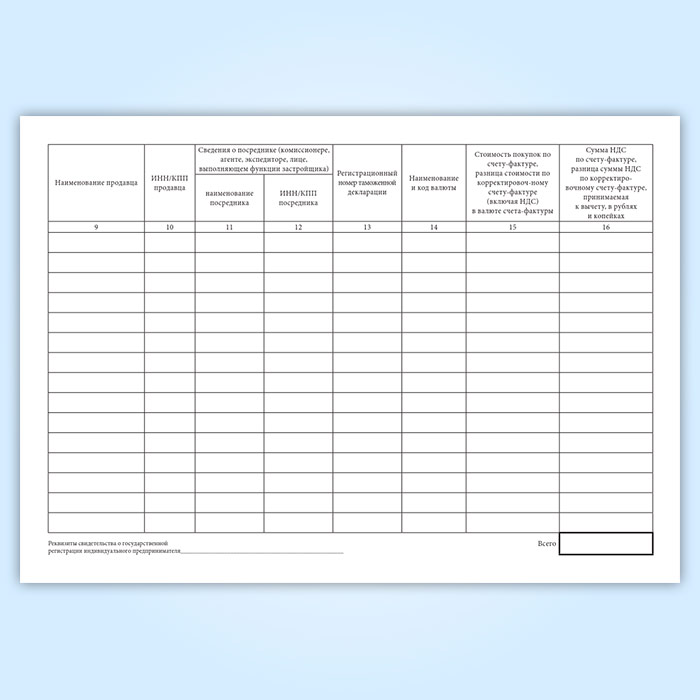 Графа 9 не заполняется при отражении данных по счету-фактуре, составленному комиссионером (агентом), приобретающим у двух и более продавцов товары (работы, услуги), имущественные права от своего имени;