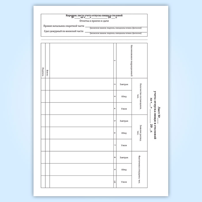 Корешок листа учета отпуска пищи в столовой имеет строки: