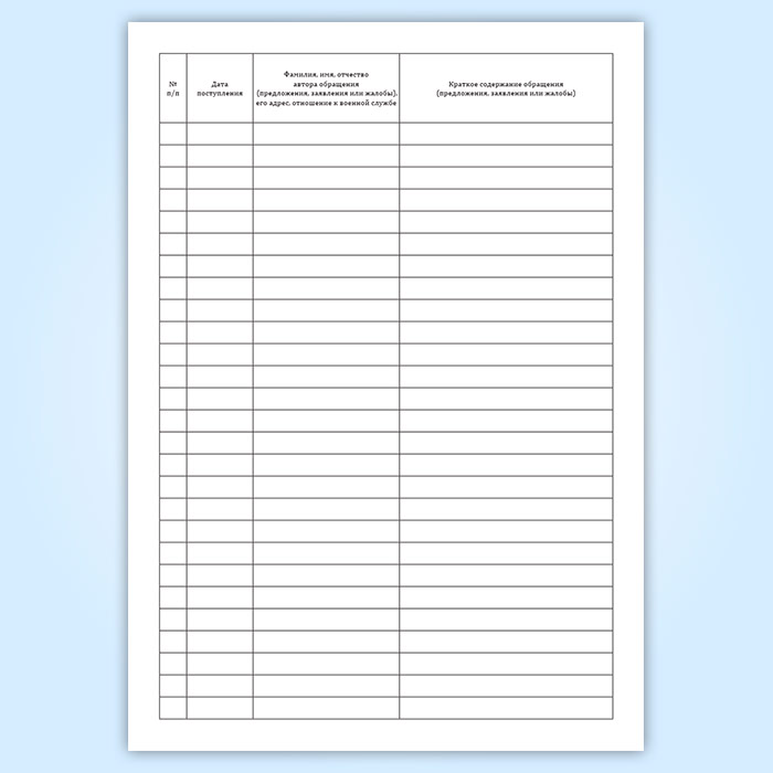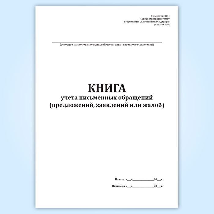 Форма книги учета письменных обращений (предложений, заявлений или жалоб) соответствует Приложению № 4 к Дисциплинарному уставу Вооруженных Сил Российской Федерации (ст. 119).