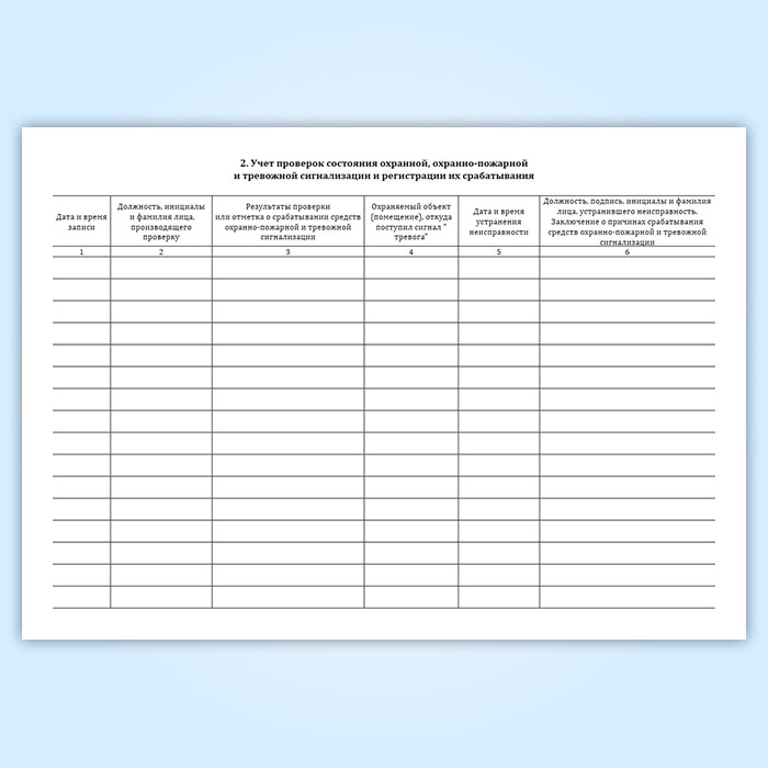 2. Учет проверок состояния охранной, охранно-пожарной и тревожной сигнализации и регистрации их срабатывания. Графы: