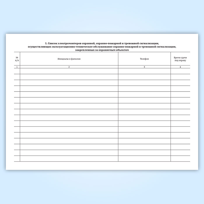 1. Список электромонтеров охранной, охранно-пожарной и тревожной сигнализации, осуществляющих эксплуатационно-техническое обслуживание охранно-пожарной и тревожной сигнализации, закрепленных за охраняемым объектом. Графы: