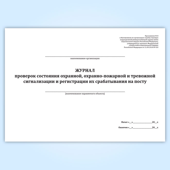 Форма журнала соответствует Приложению 8 к Приказу Росгвардии от 21.09.2018 N 420 " Об утверждении Наставления по организации службы строевых подразделений вневедомственной охраны войск национальной гвардии Российской Федерации"