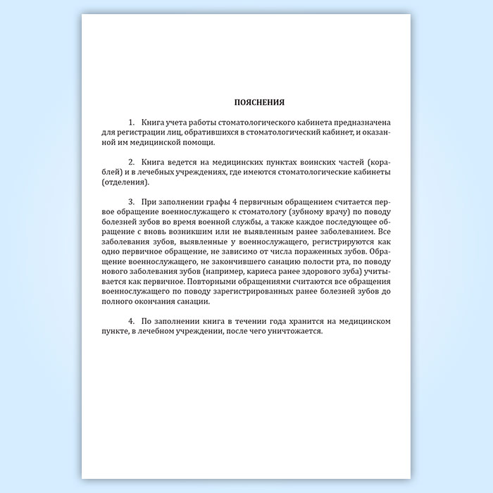 Книга учета работы стоматологического кабинета предназначена для регистрации лиц, обратившихся в стоматологический кабинет, и оказанной им медицинской помощи.