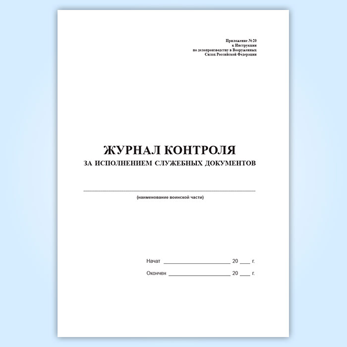 Форма журнала контроля за исполнением служебных документов соответствует Приложению 20 к Приказу Министра обороны РФ № 170 " Об утверждении Инструкции по делопроизводству в Вооруженных Силах Российской Федерации" от 04.04.2017 года.