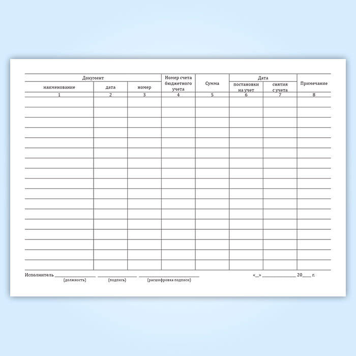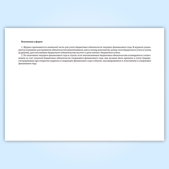 Журнал применяется в воинской части для учета бюджетных обязательств текущего финансового года. В журнале указывается основание для принятия обязательства (наименование, дата и номер документа), номер счета бюджетного учета и сумма (в рублях), дата постановки бюджетного обязательства на учет и дата снятия с бюджетного учета.