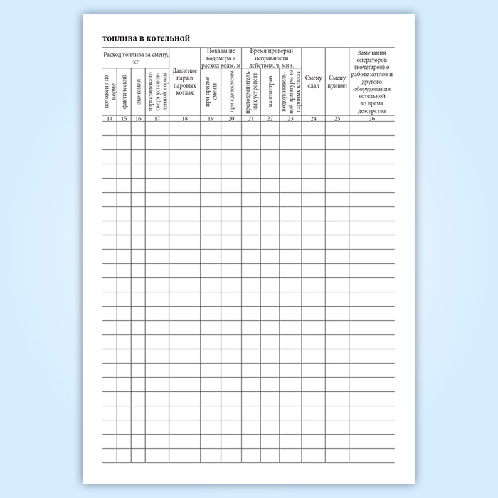 В графу 14 записываются данные, полученные на основании расчета необходимого количества топлива в зависимости от наличия потребителей и фактической температуры наружного воздуха.