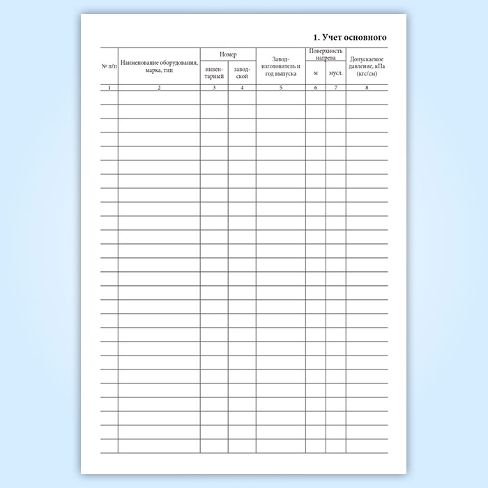 В разделе 1 ведется учет основного оборудования (котлов, водонагревателей, насосов, вентиляторов, электромоторов, фильтров и др.) на основании формуляров (паспортов) и технических описаний, а также данных ранее ведущейся книги.