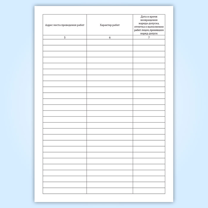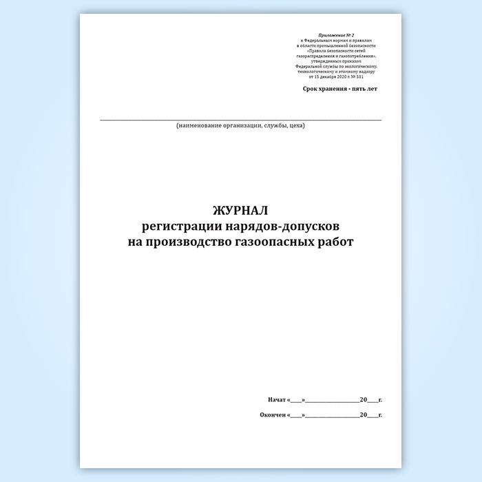 Форма журнала регистрации нарядов-допусков на производство газоопасных работ соответствует Приложению № 2 к Федеральным нормам и правилам в области промышленной безопасности “Правила безопасности сетей газораспределения и газопотребления”, утвержденным приказом Федеральной службы по экологическому, технологическому и атомному надзору от 15 ноября 2013 г. № 542, Приложению 20 к Правилам безопасности при эксплуатации автомобильных заправочных станций сжиженного газа ПБ 12-527-0372, которые утратили силу, а также Приложению 2 к Правилам безопасности сетей газораспределения и газопотребления