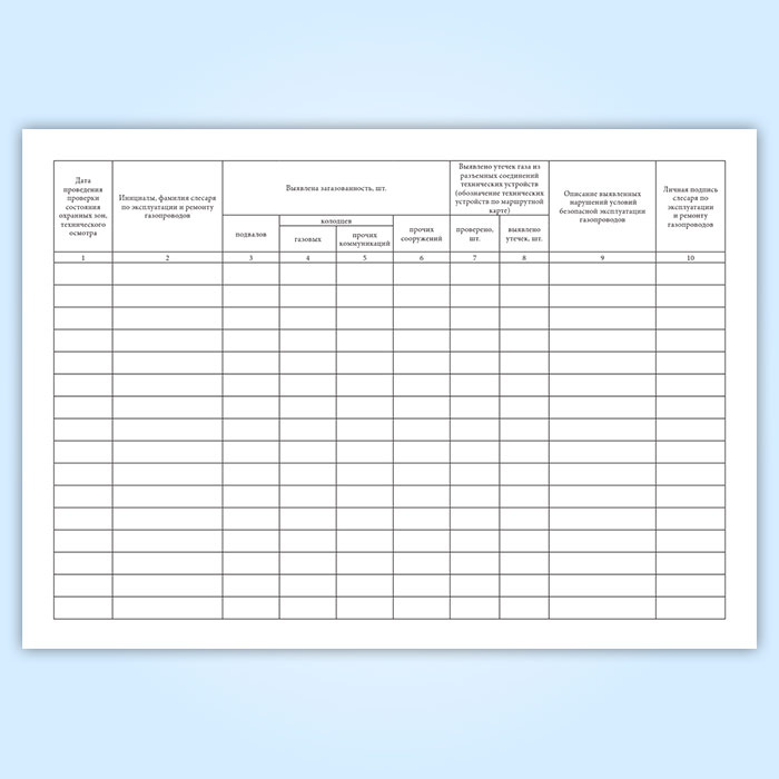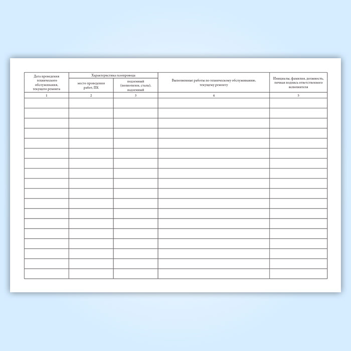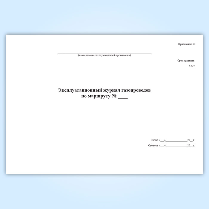 Форма эксплуатационного журнала газопроводов по маршруту соответствует приложению И к ГОСТ Р 54983-2012 Системы газораспределительные. Сети газораспределения природного газа. Общие требования к эксплуатации. Эксплуатационная документация.