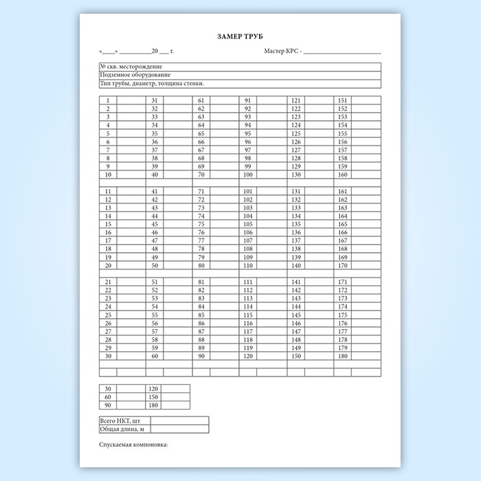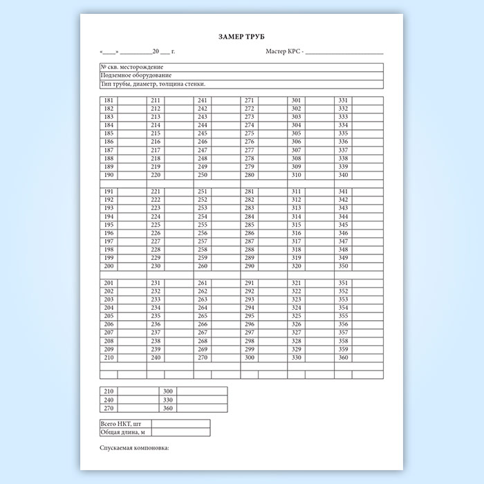 Журнал замера насосно-компрессорных труб состоит из актов замера НКТ, которые по результатам работ заполняет мастер.