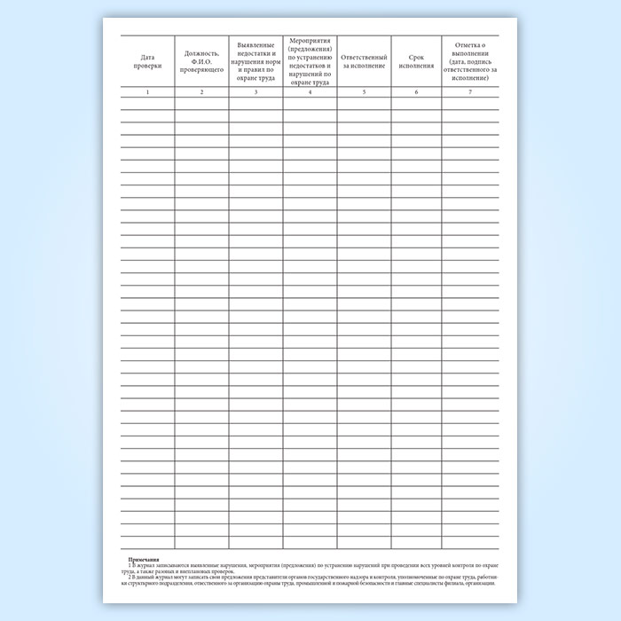 1 В журнал записываются выявленные нарушения, мероприятия (предложения) по устранению нарушений при проведении всех уровней контроля по охране труда, а также разовых и внеплановых проверок.
