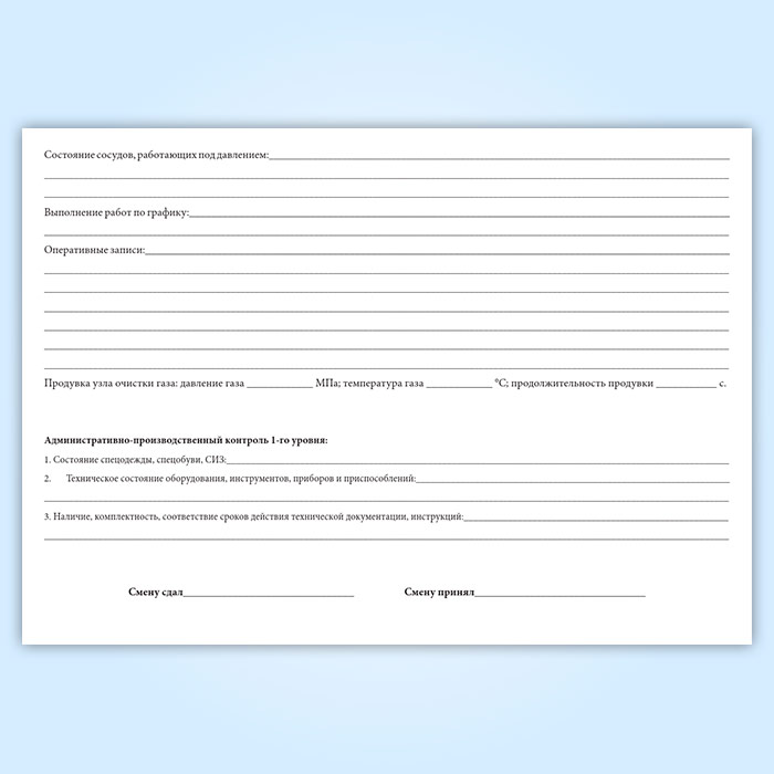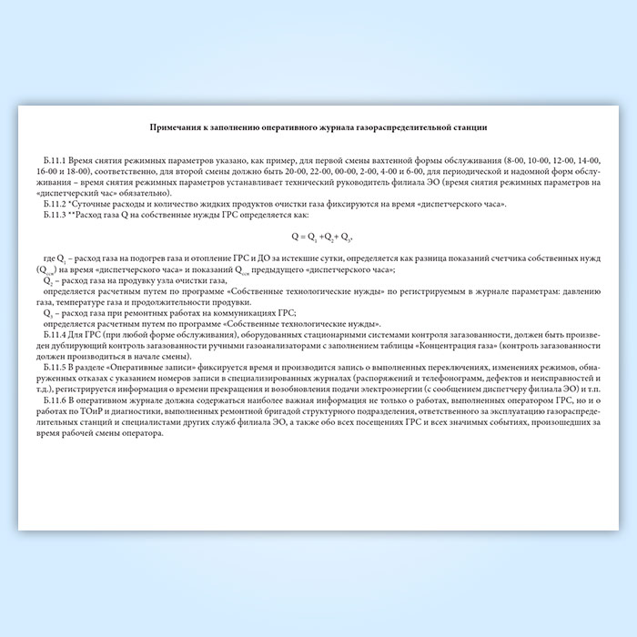 Б.11.6 В оперативном журнале должна содержаться наиболее важная информация не только о работах, выполненных оператором ГРС, но и о работах по ТОиР и диагностики, выполненных ремонтной бригадой структурного подразделения, ответственного за эксплуатацию газораспределительных станций и специалистами других служб филиала ЭО, а также обо всех посещениях ГРС и всех значимых событиях, произошедших за время рабочей смены оператора.
