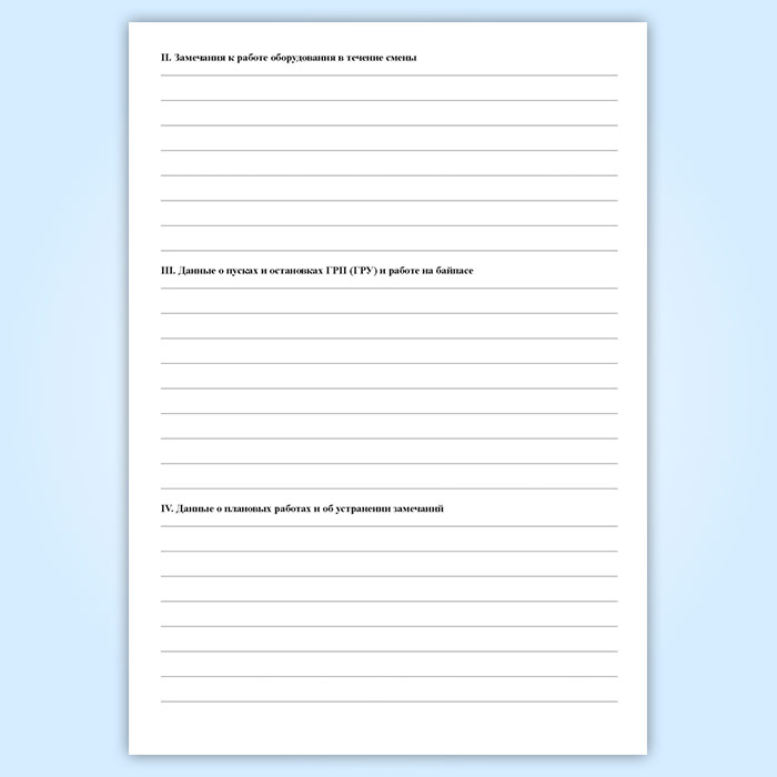В разделе "Замечания при приеме смены" отмечаются все возникшие у принимающего смену замечания, выявленные нарушения производственных инструкций и инструкций по охране труда, факты опозданий на работу принимающего смену и факты самовольного ухода с работы сдающего смену. В случае работы ГРП (ГРУ) через байпас - принимающий смену обязан убедиться, что причина открытия байпаса зафиксирована в эксплуатационном журнале и не противоречит инструкции по эксплуатации ГРП (ГРУ). Отмечаются колебания давления газа, зафиксированные на картограммах (если они выходят за пределы режима, установленного инструкцией по эксплуатации ГРП, ГРУ). Если при техническом осмотре установлено несоответствие давления после регулятора значению, определенному эксплуатационной инструкцией ГРП (ГРУ) - давление необходимо откорректировать и сделать соответствующую запись в журнале.