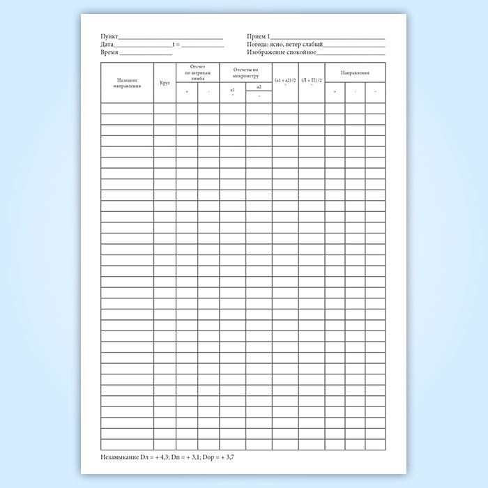 При построении классных сетей на каждой странице журнала следует указывать: название или номер пункта; дату и время (часы, минуты) производства работ; погоду, характеризуемую одним из следующих терминов: «ясно», «облачно», «пасмурно» в сочетании с оценкой ветра - «тихо», «слабый», «умеренный», «порывистый»; качество изображений - спокойные (спокойн.), колеблющиеся (колебл.). При построении разрядных сетей можно не указывать точное время производства измерений в приемах и качество изображения, а погоду коротко характеризовать терминами: «ясно», «облачно» или «пасмурно». Образец записей дан для триангуляции (полигонометрии) 4-го класса. При построении классных сетей отсчеты берутся до 0,1?, а в разрядных - округляются до 1?. В журнале разрешается использовать при одновременном выполнении угловых измерений в сетях триангуляции 1-го и 2-го разрядов. При этом измерения направлений на пункты триангуляции 2-го разряда выполняются на установках лимба, принятых для триангуляции 1-го разряда. Совмещать в одном журнале записи результатов измерений в сетях триангуляции 4-го класса, 1-го и 2-го разрядов не допускается.