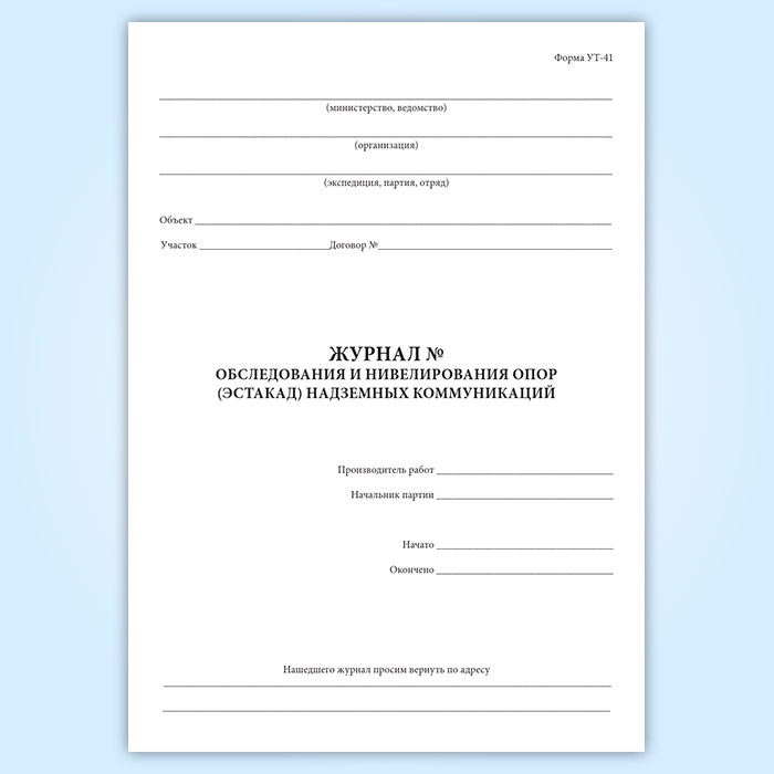 Форма журнала обследования и нивелирования опор (эстакад) надземных коммуникаций (УТ-41) соответствует Приложению 47 к Пособию по составлению и оформлению документации инженерных изысканий для строительства. Часть 1. Инженерно-геодезические изыскания СНиП II-9-78. Основной частью журнала является эскизный чертеж опоры (эстакады), представляющий собой ориентированный по местным предметам и глазомерно составленный вертикальный разрез опоры (эстакады) с расположенными на ней коммуникациями. На разрезе показываются основные конструктивные элементы опоры (эстакады). Коммуникации рисуются в виде кружков примерно на своих местах. Разница в диаметрах труб иллюстрируется изменением размера кружков. Коммуникации нумеруются порядковыми номерами. На эскизе приводятся высота основания опоры, выбираемая из журнала технического нивелирования, и габаритный размер, измеряемый в натуре. Ориентирование эскиза иллюстрируется чертежом плана опоры, на котором показываются направления на смежные опоры и здания. В журнале приводятся внутренний диаметр труб, материал труб, основное назначение коммуникаций.