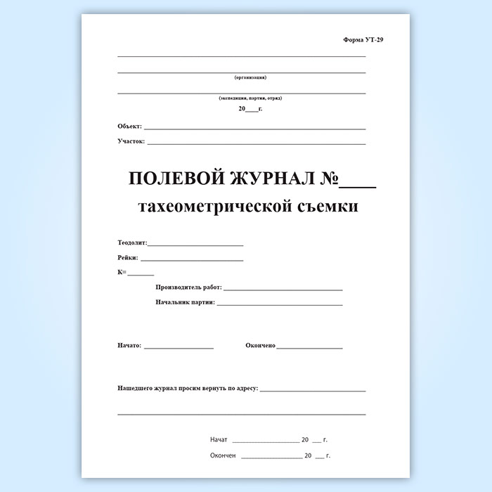 Форма полевого журнала тахеометрической съемки соответствует Приложению №8 к пункту 2.9.8 Требований к размещению и хранению средств радиационной и химической защиты. В результате выполнения тахеометрической съёмки плановые координаты и высоты точек местности получают одновременно, при использовании одного и того же прибора.