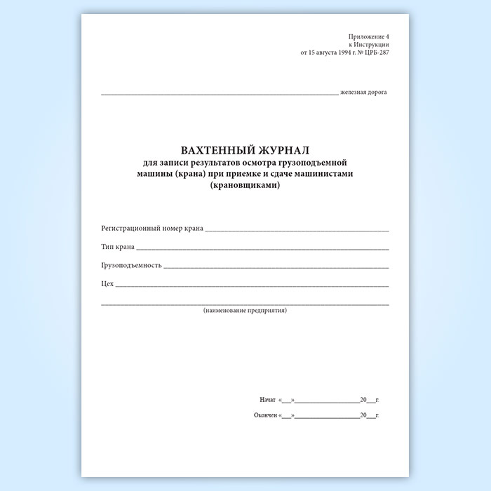 Форма Вахтенного журнала для записи результатов осмотра грузоподъемной машины (крана) при приемке и сдаче машинистами (крановщиками) соответствует Приложению 4 к Инструкции для инженерно-технических работников, ответственных за надзор по безопасной эксплуатации грузоподъемных машин, за содержание грузоподъемных машин в исправном состоянии и за безопасное производство работ кранами, подконтрольными инспекции Котлонадзора МПС России. ЦРБ-287, которая утратила силу.