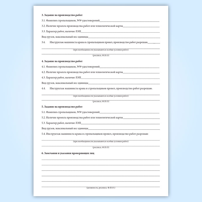 3.4. Лицо, ответственное за безопасное производство работ по перемещению грузов кранами, производит инструктаж машиниста крана и стропальщиков об особенностях производства работ, установке крана, о порядке и габаритах складирования грузов и разрешает производство работ, указывая свою фамилию и ставит подпись. При необходимости указывает особые условия работ, например производство при передаче крана в течение смены в распоряжение другого производителя работ. Количество разделов «Задание на производство работ» может быть увеличено.