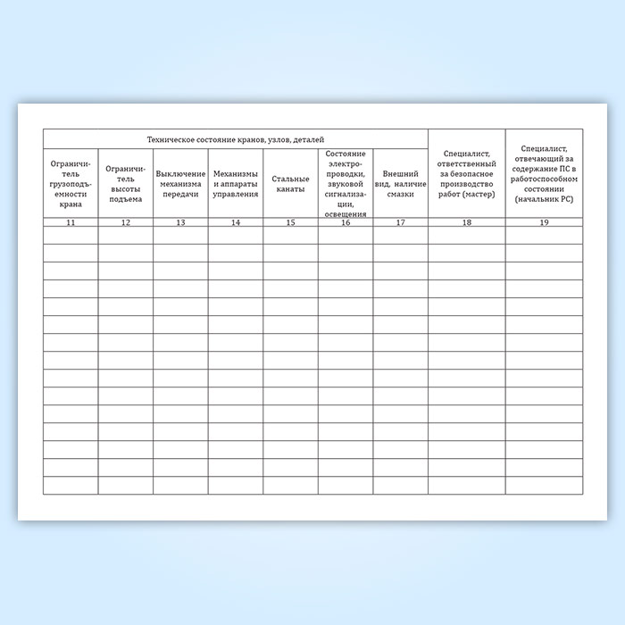 В журнал заносятся данные по каждой смене, результат осмотра технического состояния электропроводки, звуковой сигнализации, освещения, работоспособности всех узлов и агрегатов. Специалист, ответственный за безопасное производство работ (мастер) заполняет журнал перед началом и после окончания смены на мостовых и козловых кранах.