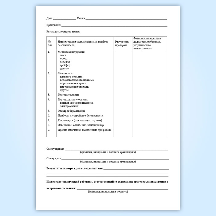 См. также: Вахтенный журнал крановщика, Вахтенный журнал крановщика автомобильного крана