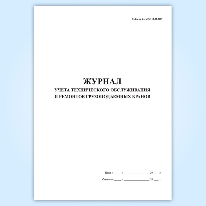 Форма Журнала учета технического обслуживания и ремонтов грузоподъемных кранов соответствует Таблице 4 к МДС 12-32.2007. Типовые нормы периодичности, трудоемкости и продолжительности технического обслуживания и ремонта грузоподъемных кранов.