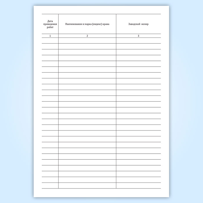 См. также Журнал осмотра, технического обслуживания и ремонта грузоподъемных кранов, графы которого несколько отличаются.
