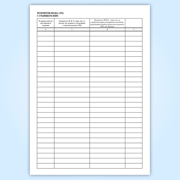 6. Должность, Ф.И.О. –лица, отв. за содержание крана в исправном состоянии, разрешившего работу крана после ремонта (ТО), его подпись