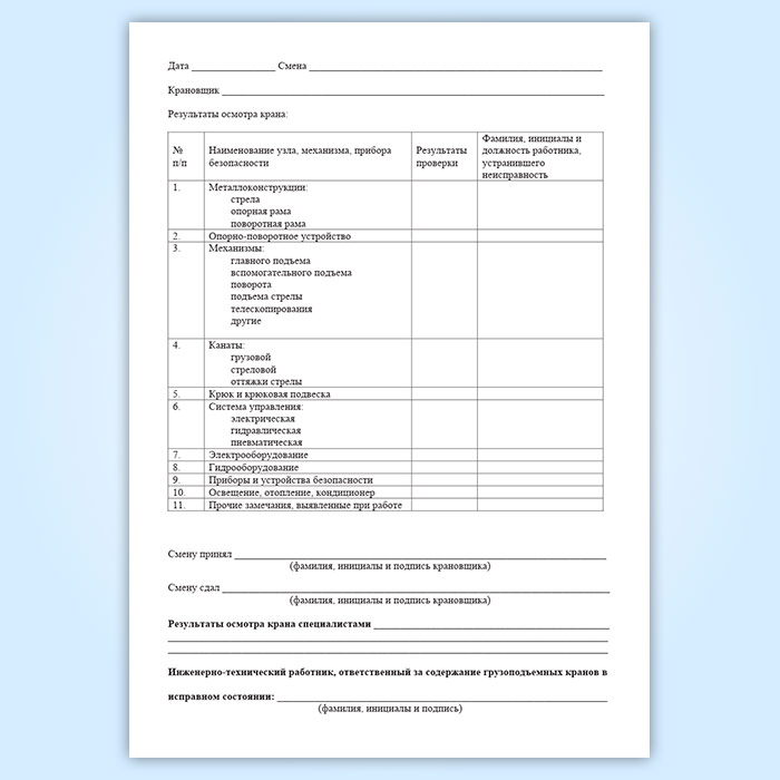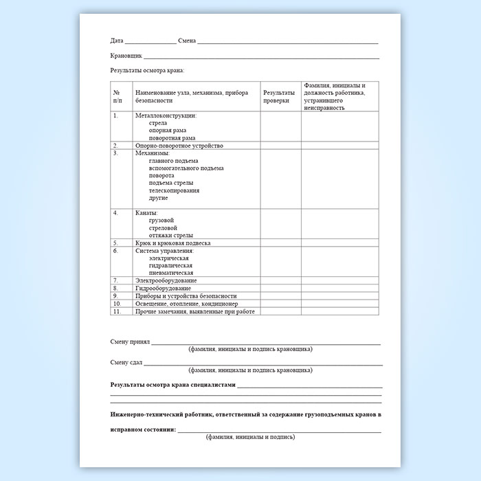 Крановщики (машинисты) должны производить осмотр грузоподъемных машин перед началом работы, для чего администрацией должно быть выделено соответствующее время. Для записи результатов осмотра и проверки крановщиками грузоподъемной машины должен вестись журнал.