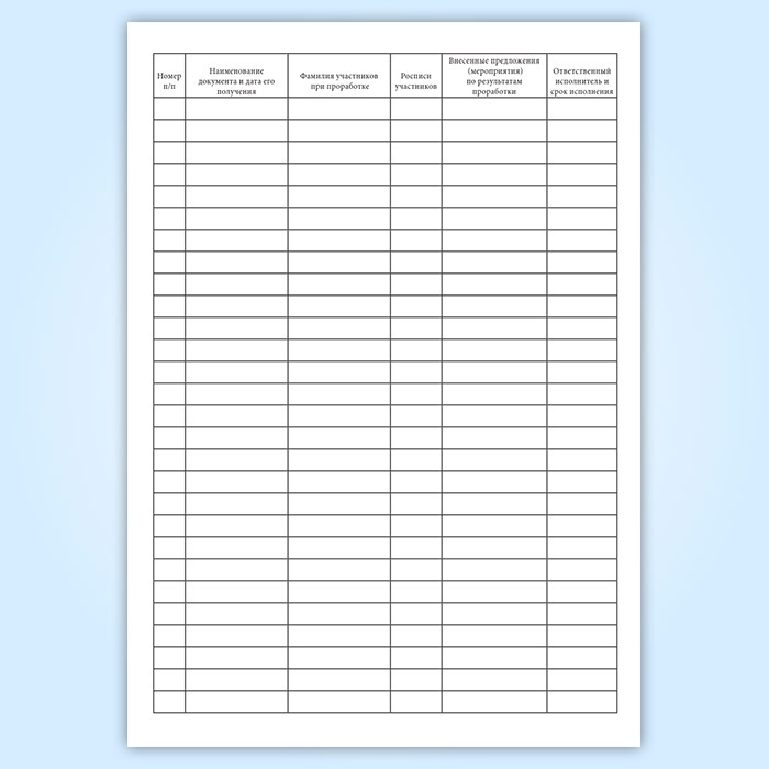 Для учета директивных материалов и контроля над их проработкой, а также за их выполнением ведется журнал проработки директивных материалов. Подобный журнал должен вестись также во всех структурных подразделениях предприятия.