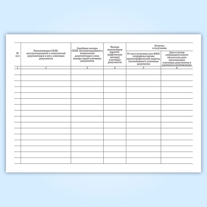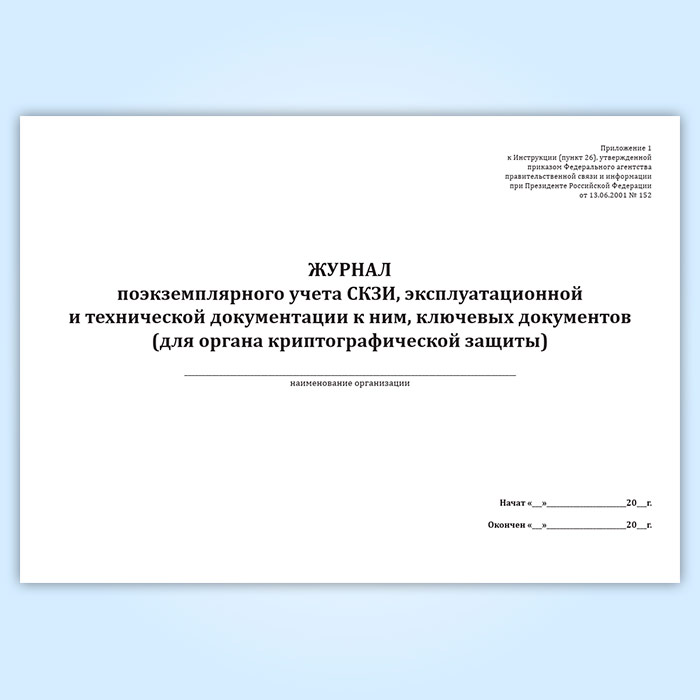 Форма журнала поэкземплярного учета СКЗИ, эксплуатационной и технической документации к ним, ключевых документов (для органа криптографической защиты) соответствует Приложению №1 к Приказу ФАПСИ от 13.06.2001 N 152 "Об утверждении Инструкции об организации и обеспечении безопасности хранения, обработки и передачи по каналам связи с использованием средств криптографической защиты информации с ограниченным доступом, не содержащей сведений, составляющих государственную тайну"