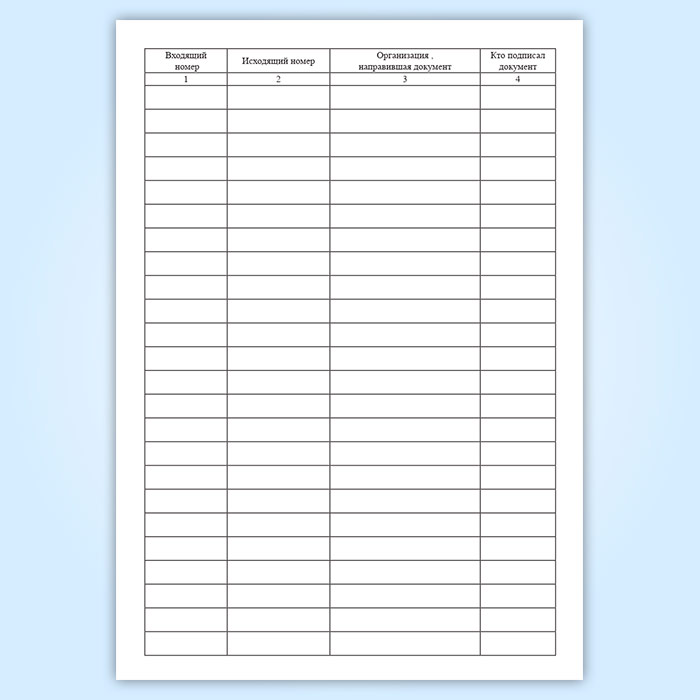 Форма журнала регистрации входящих документов не имеет унифицированной формы. Журнал регистрации входящих документов может быть изготовлен индивидуально.