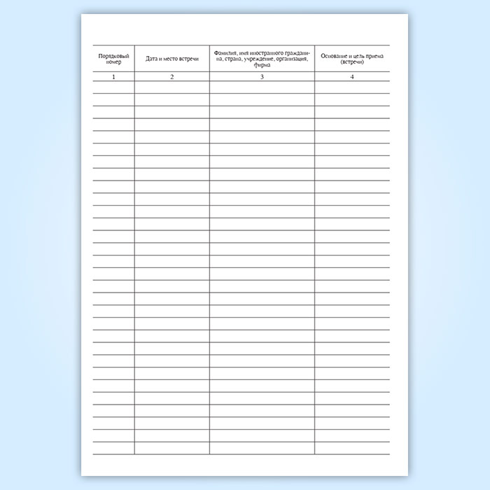 Форма журнала учета приемов иностранных граждан (№20) соответствует Приложению к Приказу Минкультуры РФ от 13.08.2008 N 40 "Об утверждении Инструкции о порядке приема и работы с гражданами иностранных государств в Министерстве культуры Российской Федерации"