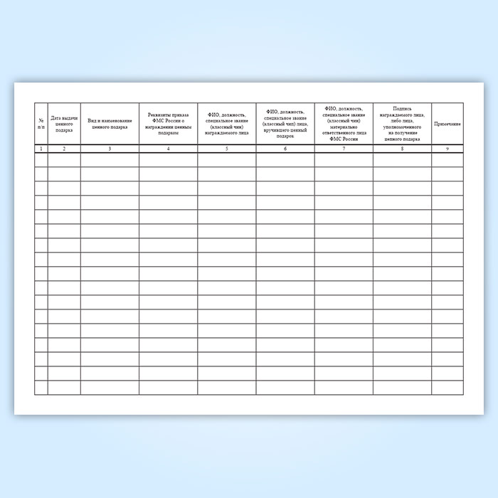 Форма журнала учета выдачи ценных подарков соответствует Приложению № 1 к Положению о подарочном фонде директора Федеральной миграционной службы. Журнал ведется для учета и выдачи подарков, предназначенных для должностных лиц государственных или ведомственных служб.