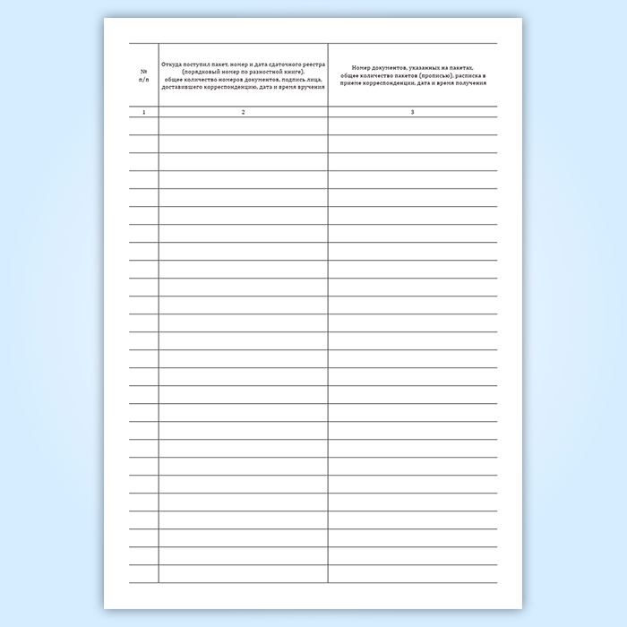 2. Откуда поступил пакет, номер и дата сдаточного реестра (порядковый номер по разностной книге), общее количество номеров документов, подпись лица, доставившего корреспонденцию, дата и время вручения