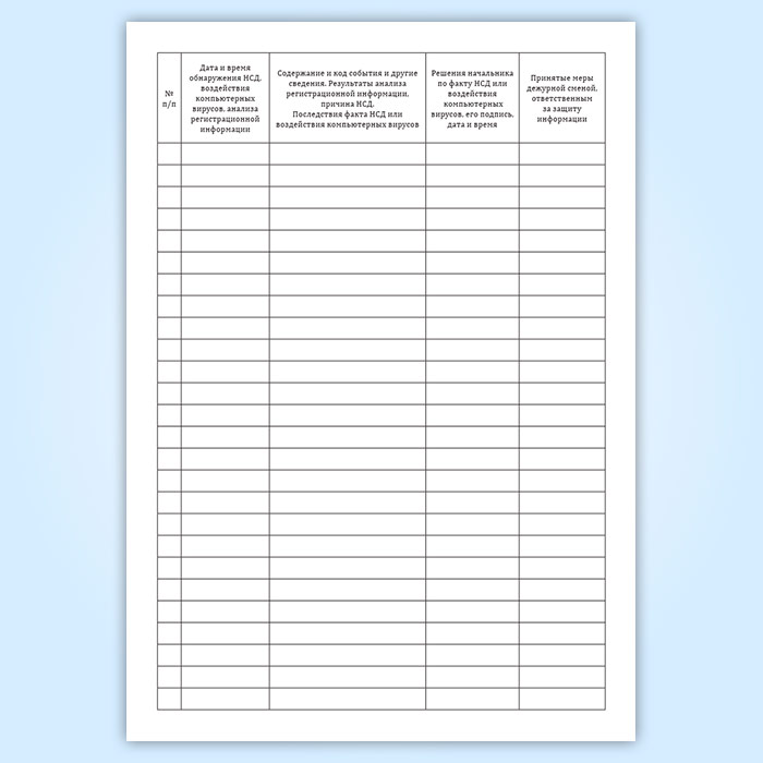 При подготовке документации по вопросам обеспечения безопасности оператором организуется ведение журнала учета фактов несанкционированного доступа и воздействия компьютерных вирусов, в котором указывают дату и время обнаружения НСД, воздействия компьютерных вирусов и анализ регистрационной информации.