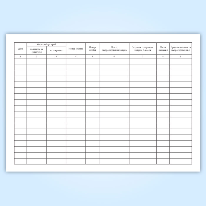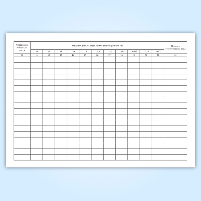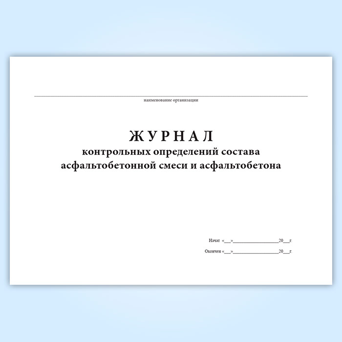 Форма журнала контрольных определений состава асфальтобетонной смеси и асфальтобетона соответствует Форме 11 Приложения 1 к Пособию по строительству асфальтобетонных покрытий и оснований автомобильных дорог и аэродромов (к СНиП 3.06.03-85 и СНиП 3.06.06-88).