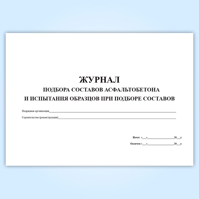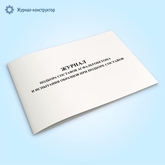 Журналы лабораторного контроля, к которым относится Журнал подбора составов асфальтобетона и испытания образцов при подборе составов, ведутся в строительных лабораториях в течение всего периода строительства объекта (участка) и выдаются руководителями центральных лабораторий автодоров, управлений автомобильных дорог, строительства. На титульном листе журналов указываются подрядная организация, ответственная за строительство.