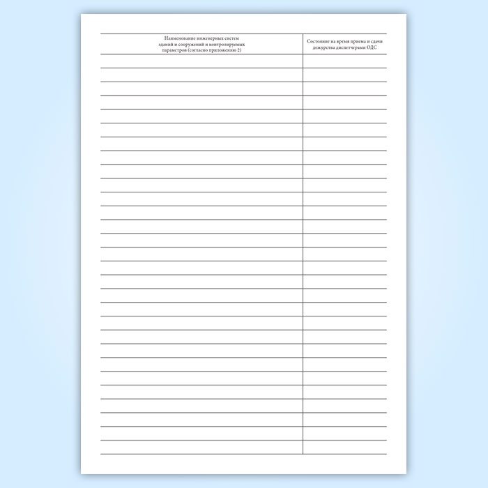 Форма журнала технического состояния инженерных систем и параметров работы инженерного оборудования, подключенного к АС ДКиУ соответствует Приложению 6 к Положению об объединенной диспетчерской службе по автоматизированному контролю и управлению инженерным оборудованием зданий и сооружений в районах города Москвы.