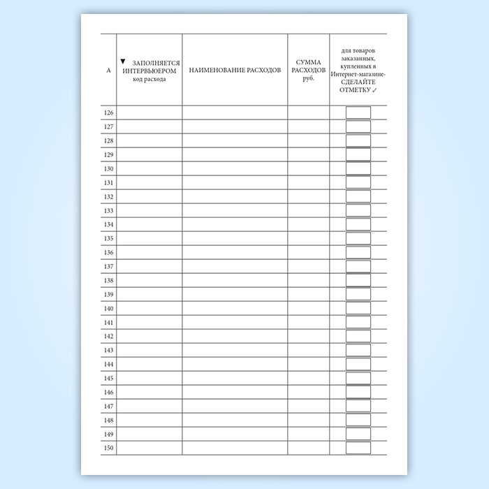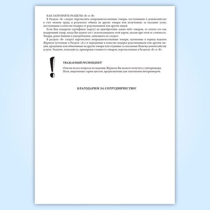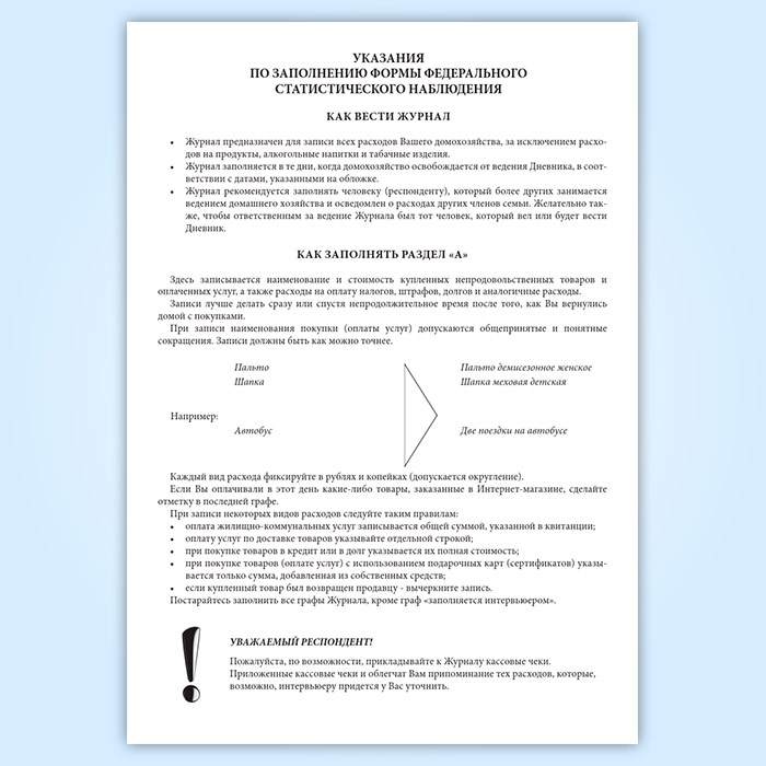 Журнал рекомендуется заполнять человеку (респонденту), который более других занимается ведением домашнего хозяйства и осведомлен о расходах других членов семьи. Желательно также, чтобы ответственным за ведение Журнала был тот человек, который вел или будет вести Дневник.
