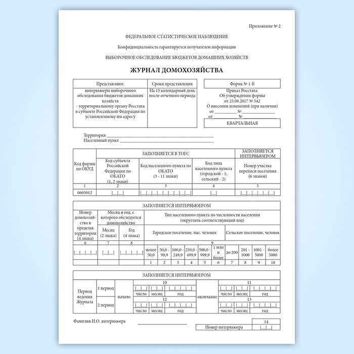 Форма журнала домохозяйства (1-Б) соответствует Приложению №2 к Приказу Росстата от 23.08.2017 N 542 "Об утверждении статистического инструментария для проведения выборочного обследования бюджетов домашних хозяйств"